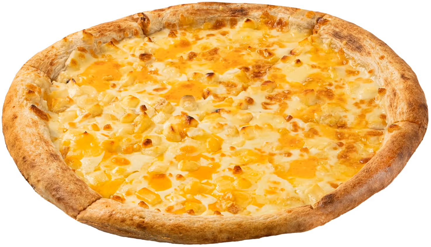 Salsa blanca, cheddar, mozzarella, tomates cherry, cebolla en dados, pollo.