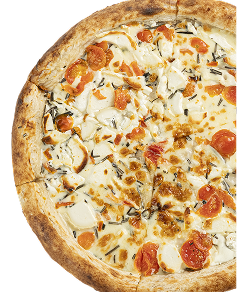 Salsa blanca, queso de cabra, mozzarella, tomates cherry, romero.