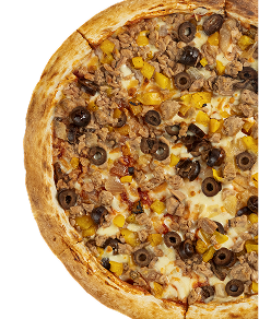 Salsa de tomate italiana (CIRIO), mozzarella, pimiento amarillo, aceitunas negras, cebolla en dados, atún.